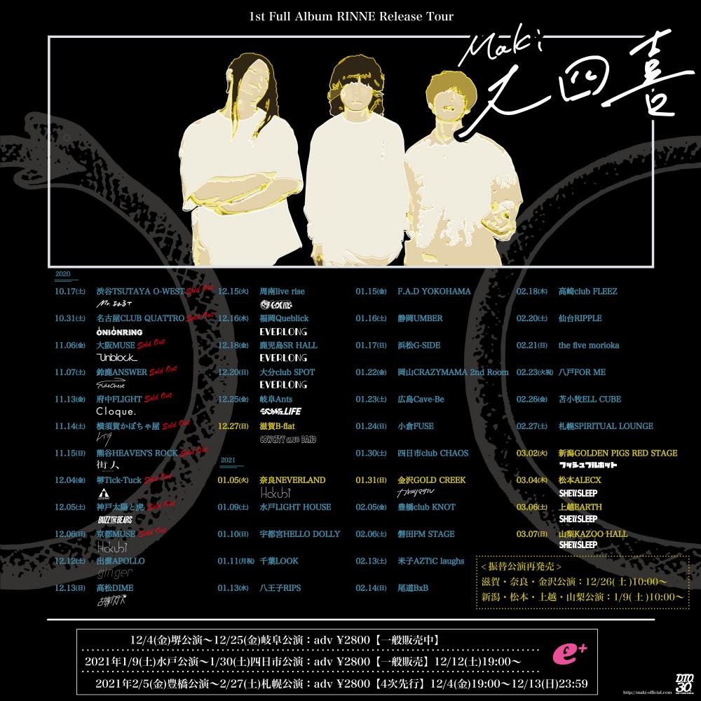 Maki presentsMaki 1st Full Album RINNE Release Tour 「大四喜」OPEN 18:00 / START 18:30 adv ¥2800(D別)※Thank you SOLD OUT!!! / day ※Thank you SOLD OUT!!! [出演] -チケット取扱い- |