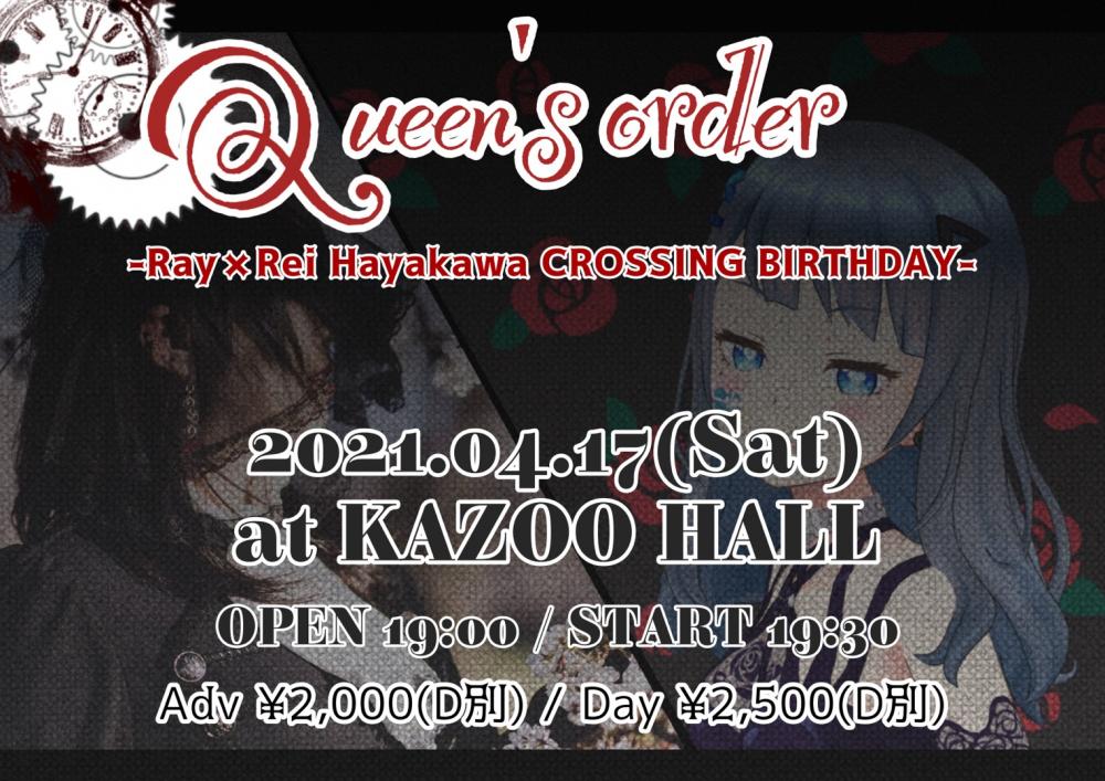 玲 x KAZOO HALL presentsQueen's Order -Ray x Rei Hayakawa CROSSING BIRTHDAY-OPEN 19:00 / START 19:30 adv ¥2000(D別) / day ¥2500(D別) [出演] -チケット取扱い- |