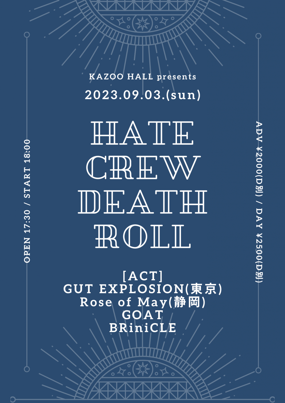 KAZOO HALL presentsHate Crew DeathrollOPEN 17:30 / START 18:00 adv ¥2000(D別) / day ¥2500(D別) [出演] [チケット取扱い] |