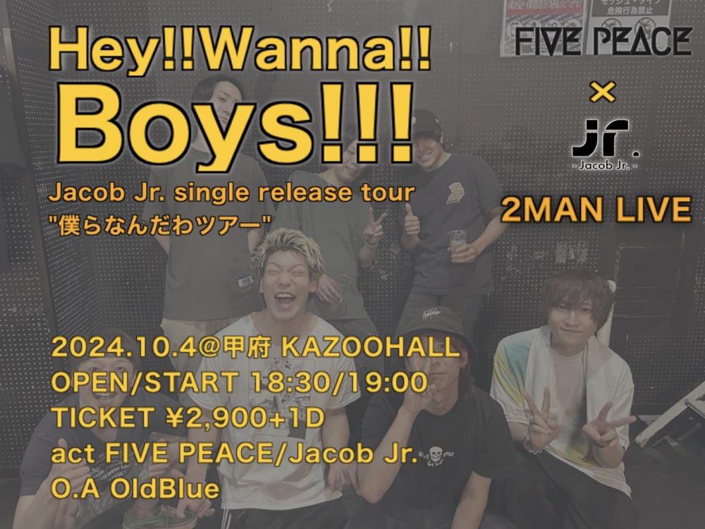 Jacob Jr. × FIVE PEACE presentsHey!!Wanna!!Boys!!! -Jacob Jr. single release tour "僕らなんだわツアー”-OPEN 18:30 / START 19:00 adv ¥2900(D別) / day TBA [出演] [チケット取扱い] |
