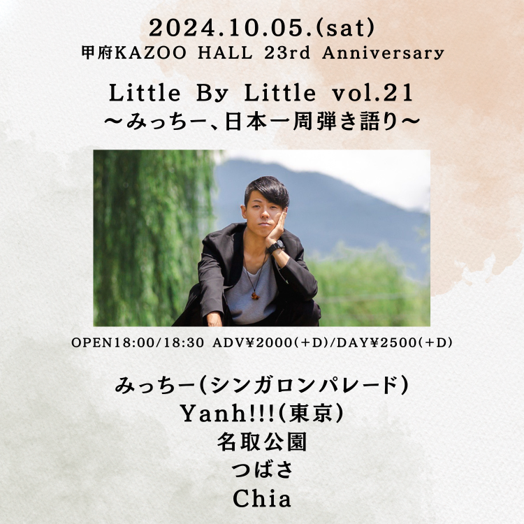 KAZOO HALL 23rd AnniversaryLittle By Little vol.21 〜みっちー、日本一周弾き語り〜OPEN 18:00 / START 18:30 adv ¥2000(D別) / day ¥2500(D別) [出演] [チケット取扱い] |