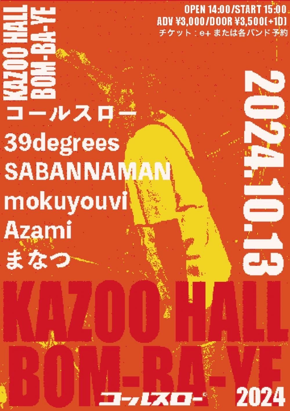 KAZOO HALL 23rd Anniversaryコールスロー presents KAZOO HALL BOM-BA-YE 2024OPEN 14:00 / START 15:00 adv ¥3000(D別) / day ¥3500(D別) [出演] [チケット取扱い] |