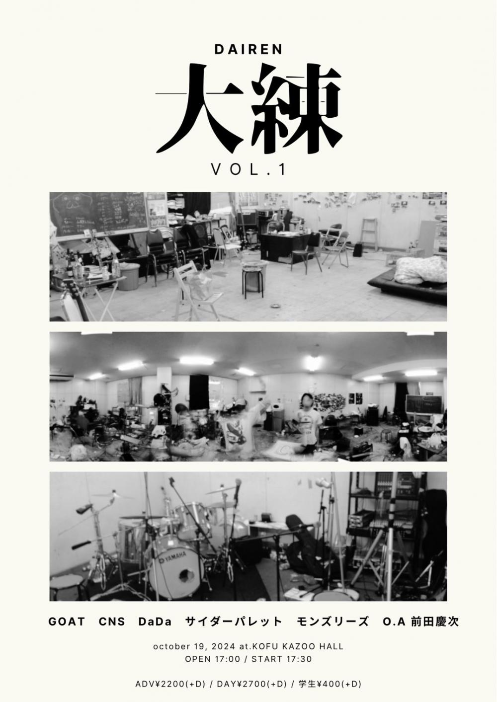 西岡田前田 presents大練OPEN 17:00 / START 17:30 adv ¥2200(D別) / day ¥2700(D別) [出演] [チケット取扱い] |