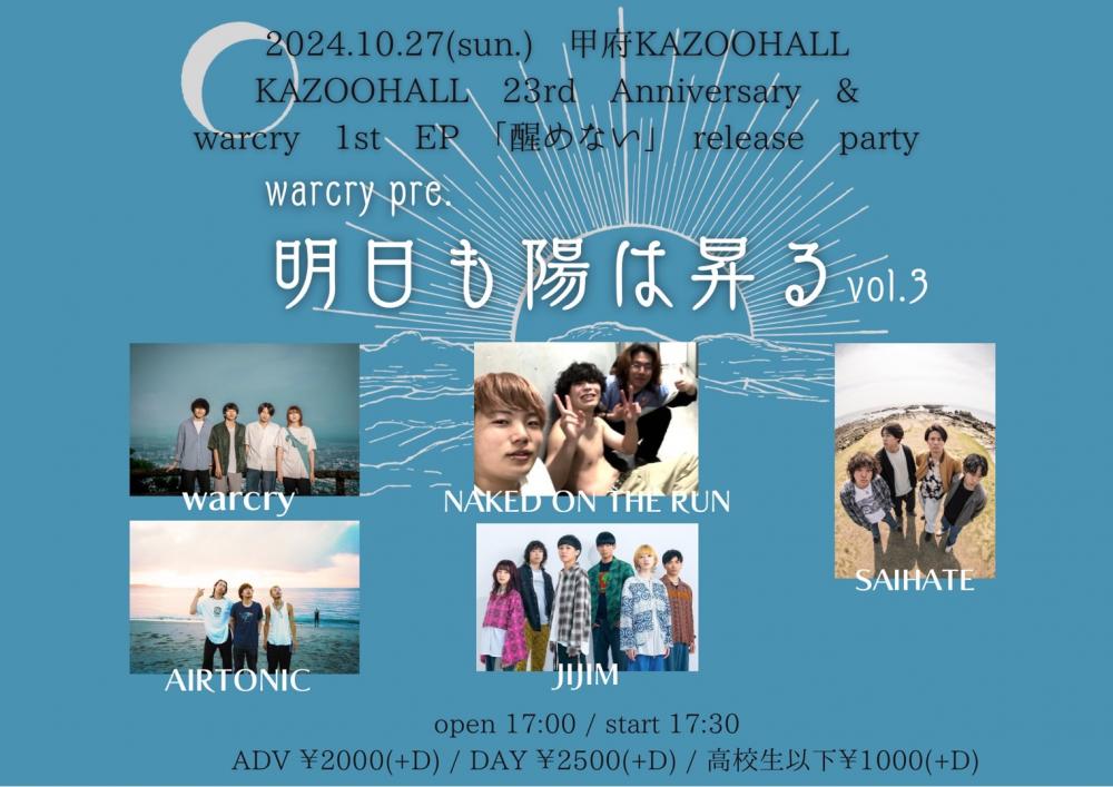 KAZOO HALL 23rd Anniversarywarcry presents 明日も陽は昇る vol.3 -warcry 1st EP 『醒めない』Release Party-OPEN 17:15 / START 18:15 adv ¥2000(D別)※高校生割引¥1000(+D) / day ¥2500(D別) [出演] [チケット取扱い] |