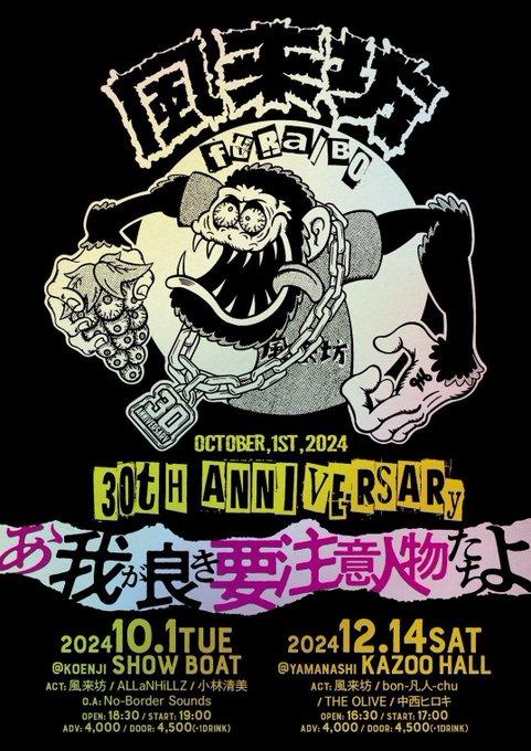 風来坊デビュー30周年記念ライブ 『あゝ我が良き要注意人物達よ』OPEN 16:30 / START 17:00 adv 一般 ¥4000(D別) / 学割 ¥2000(D別) / day ¥4500(D別) / 学割 ¥2500(D別) [出演] [チケット取扱い] |