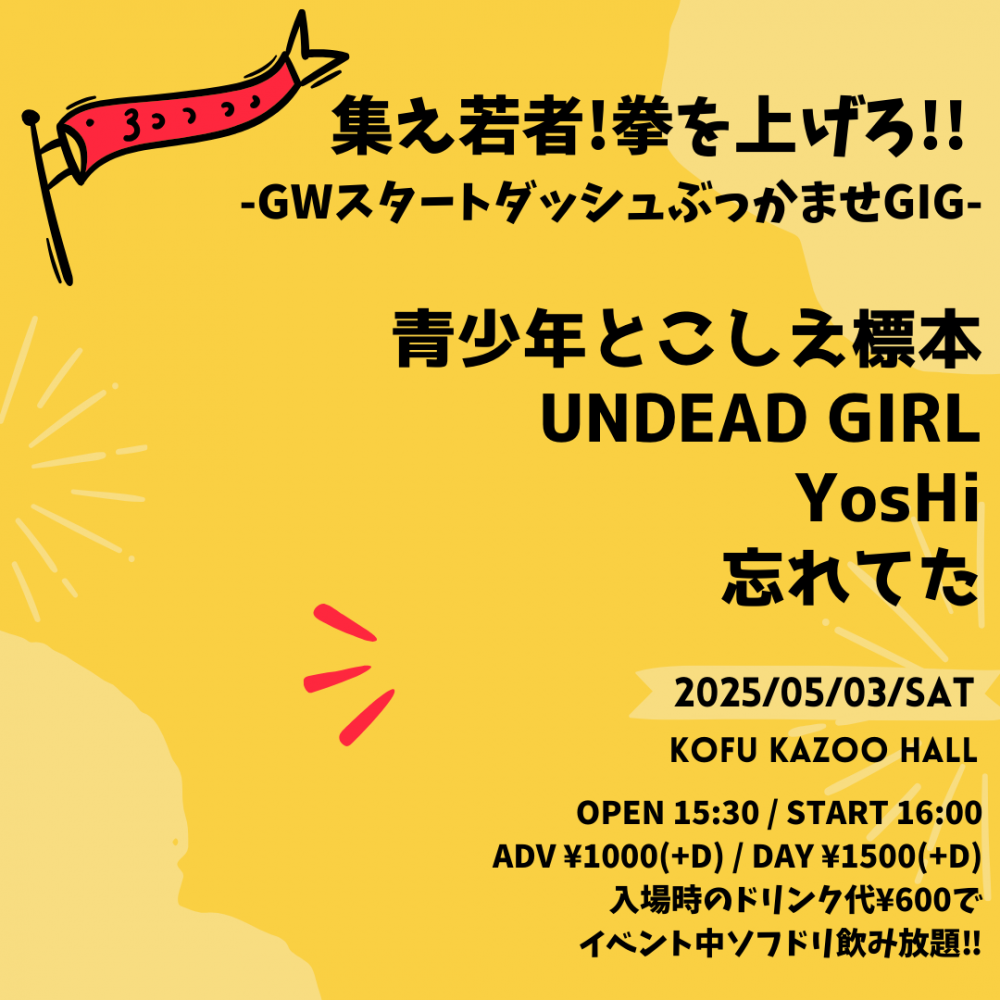 KAZOO HALL presents集え若者!拳を上げろ!! -GWスタートダッシュぶっかませGIG-OPEN 15:30 / START 16:00 adv ¥1000(D別)※SD飲み放題 / day ¥1500(D別)※SD飲み放題 [出演] [チケット取扱い] |