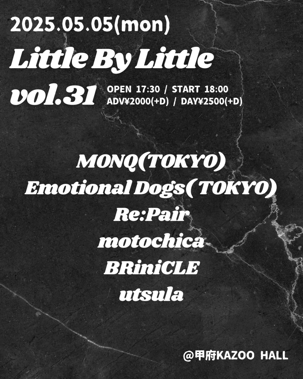 KAZOO HALL presentsLittle By Little vol.31OPEN 17:30 / START 18:00 adv ¥2000(D別) / day ¥2500(D別) [出演] [チケット取扱い] |