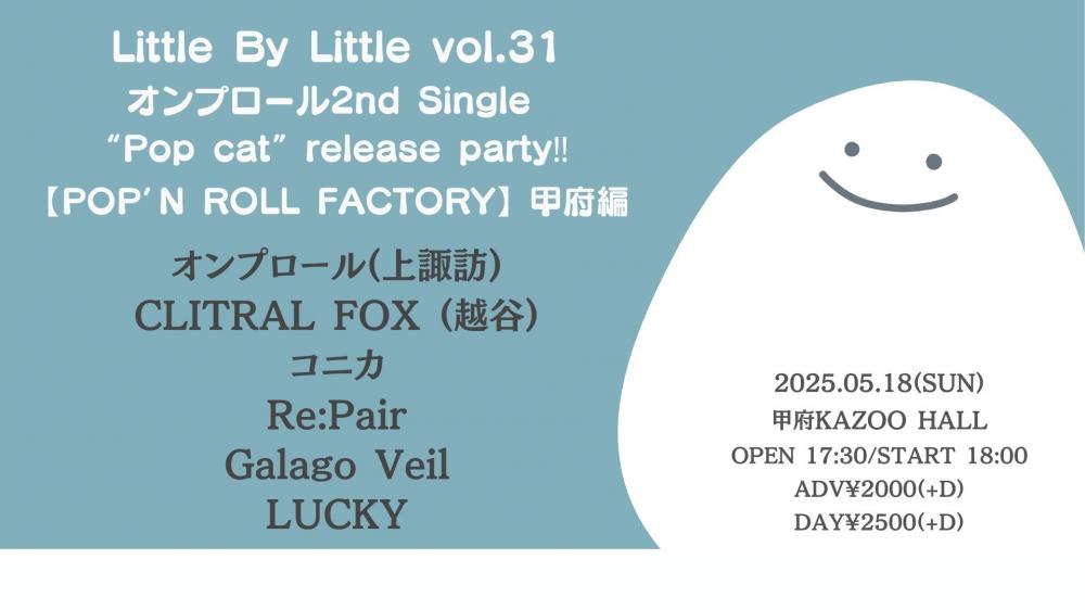 KAZOO HALL presentsLittle By Little vol.32 オンプロール2nd Single “Pop cat” release party‼ 【POP’N ROLL FACTORY】 甲府編OPEN 17:30 / START 18:00 adv ¥2000(D別) / day ¥2500(D別) [出演] [チケット取扱い] |