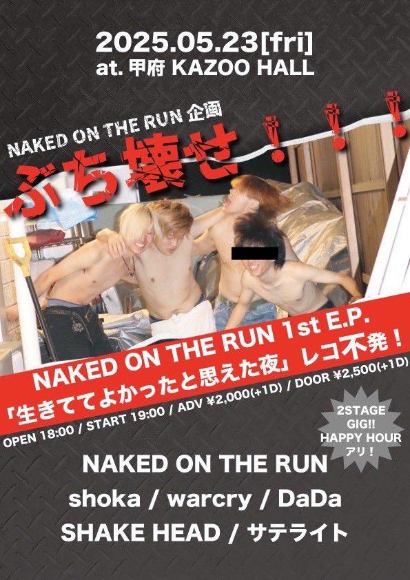NAKED ON THE RUN presentsぶち壊せ!!!OPEN 18:00 / START 19:00 adv ¥2000(D別) / day ¥2500(D別) [出演] [チケット取扱い] |
