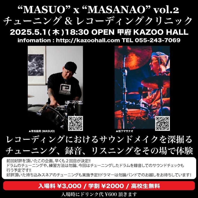 KAZOO HALL presents"MASUO" x "MASANAO" vol.2 チューニング&レコーディングクリニックOPEN 18:30 / START 19:00 adv ¥3000(+D)/学割¥2000(+D)/高校生無料(+D) / day ¥3000(+D)/学割¥2000(+D)/高校生無料(+D) [出演] [チケット取扱い] |