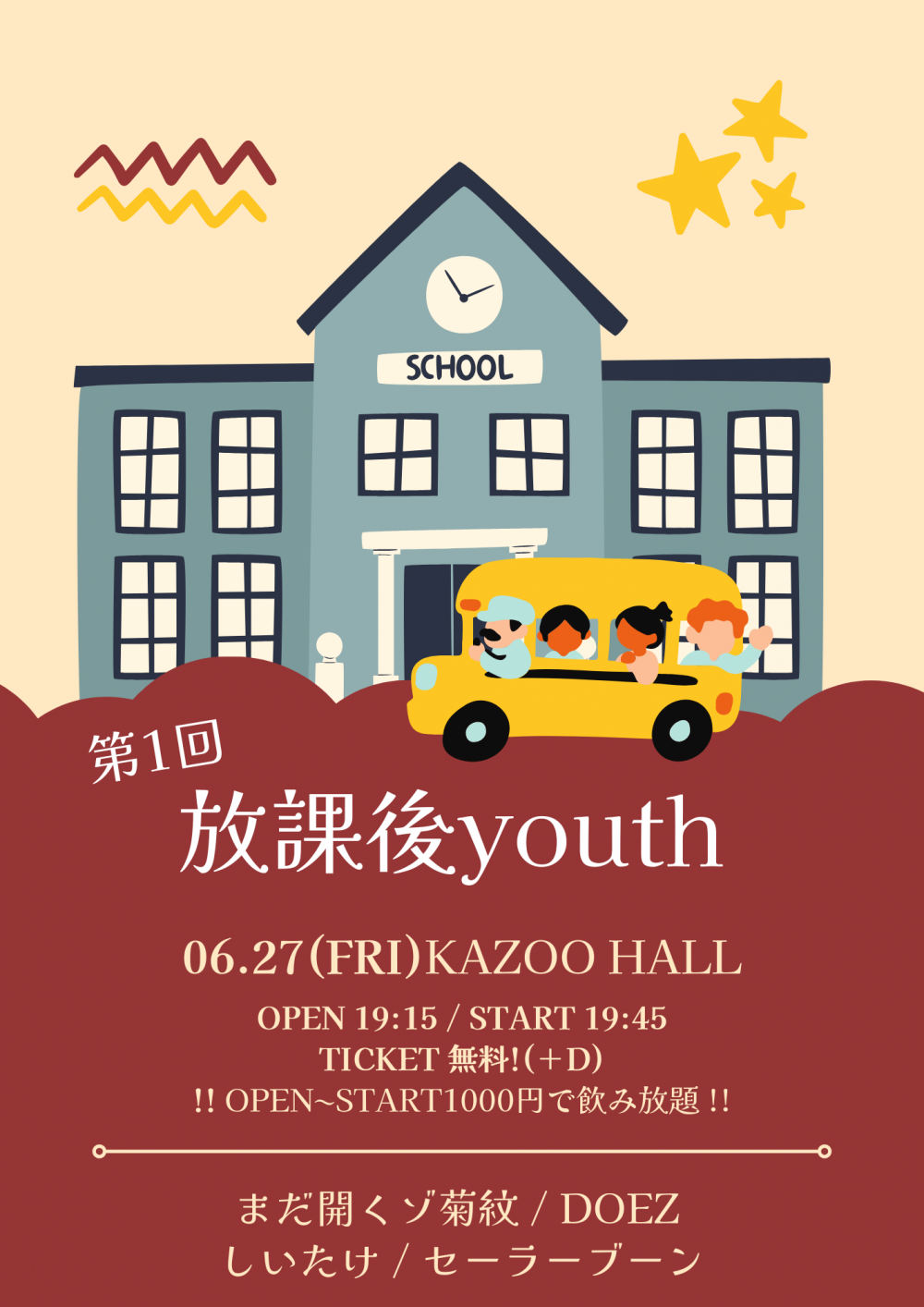 KAZOO HALL presents第1回 放課後youthOPEN 19:15 / START 19:45 adv 無料(D別) / day 無料(D別) [出演] [チケット取扱い] |