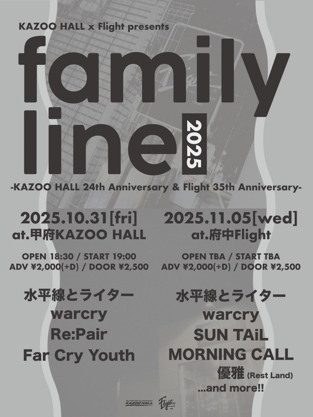 KAZOO HALL x Flight presentsfamily line 2025 -KAZOO HALL 24th Anniversary & Flight 35th Anniversary-OPEN 18:30 / START 19:00 adv ¥2000(D別) / day ¥2500(D別) |