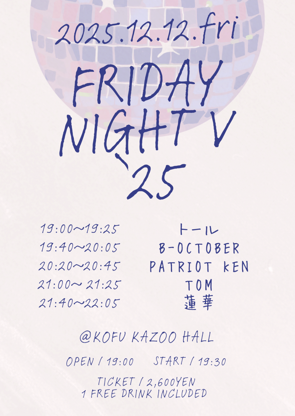 KAZOO HALL presentsFRIDAY NIGHT V '25OPEN 18:30 / START 19:00 adv ¥2600(D込) / day ¥2600(D込) |