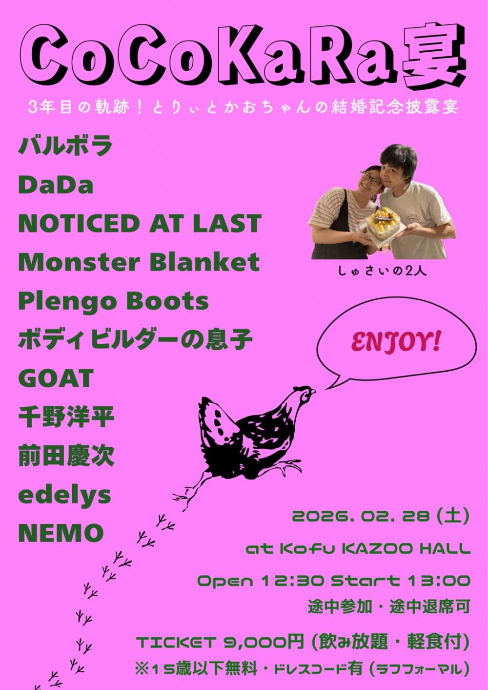 とりぃ&かおちゃん presentsCoCoKaRa宴OPEN 12:30 / START 13:00 adv ¥9000(飲み放題・軽食付) / day TBA [出演] [チケット取扱い] |