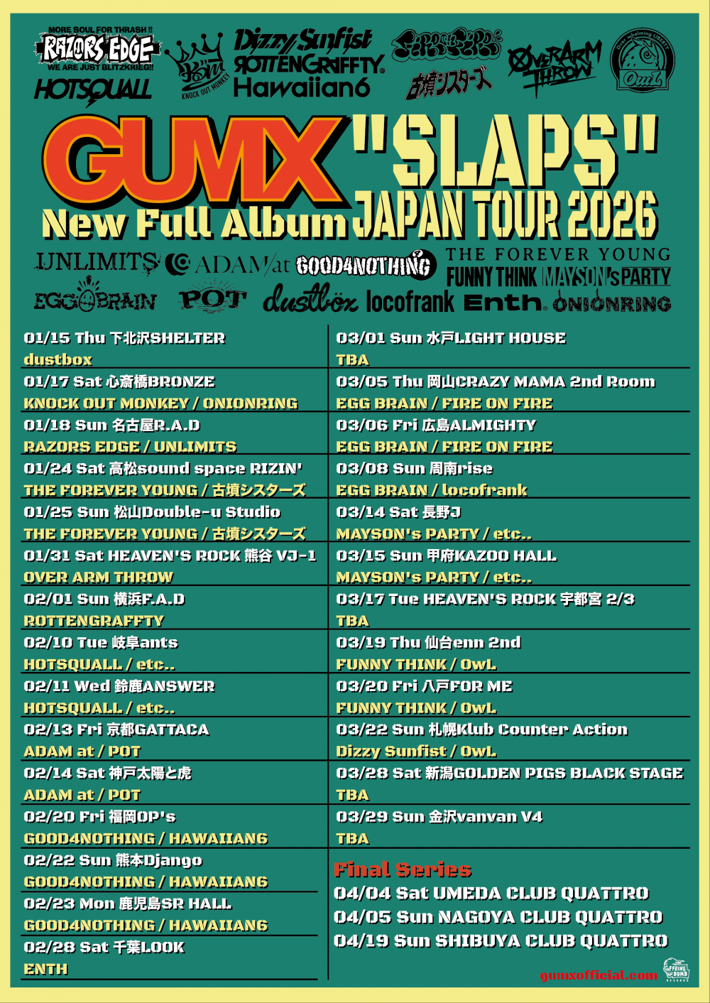 CAFFEINE BOMB RECORDS presents「GUMX New Full Album "SLAPS" JAPAN TOUR 2026」OPEN 17:00 / START 17:30 adv ¥3500(D別) / day ¥4200(D別) [出演] [チケット取扱い] |