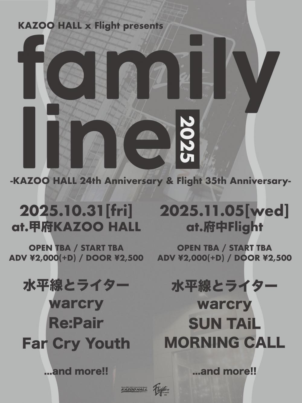 KAZOO HALL x Flight presentsfamily line 2025 -KAZOO HALL 24th Anniversary & Flight 35th Anniversary-OPEN TBA / START TBA adv TBA / day TBA [出演] [チケット取扱い] |