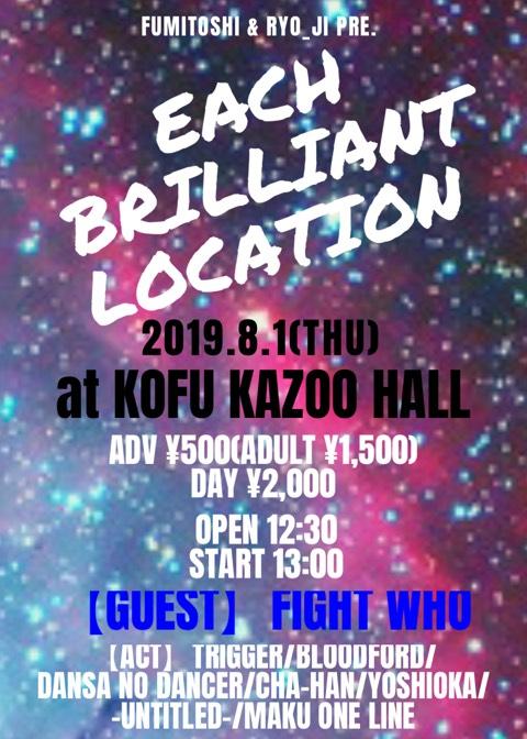 Fumitoshi & Ryo_ji presentsEach Brilliant LocationOPEN 12:30 / START 13:00 adv 高校生以下¥500(+1D) 一般¥1500(+1D) / day ¥2000(+1D) [出演] チケット取扱い:各出演バンド / KAZOO HALL:TEL 055-243-7069 |