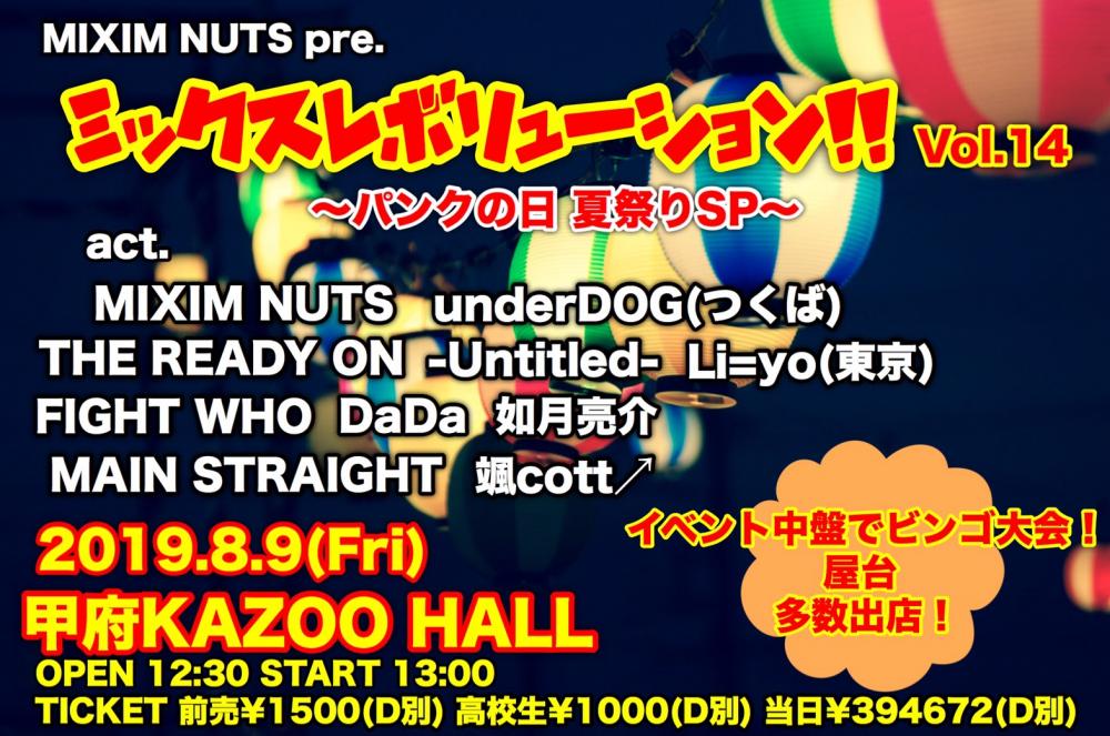 MIXIM NUTS presentsミックスレボリューション‼︎Vol.14 パンクの日〜夏祭りSP〜OPEN 12:30 / START 13:00 adv ¥1500(D別)※高校生¥1000 / day ¥394672(D別)※高校生¥1000 [出演] 各出演バンド / KAZOO HALL:TEL 055-243-7069 |