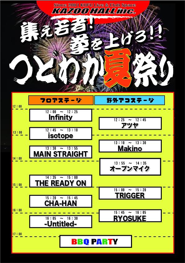 KAZOO HALL presents集え若者!拳を上げろ!! 〜つどわか夏祭り〜OPEN 11:30 / START 12:00 adv ¥500(D別) / day ¥600(D別) [出演] チケット取扱い:各出演バンド / KAZOO HALL:TEL 055-243-7069 |