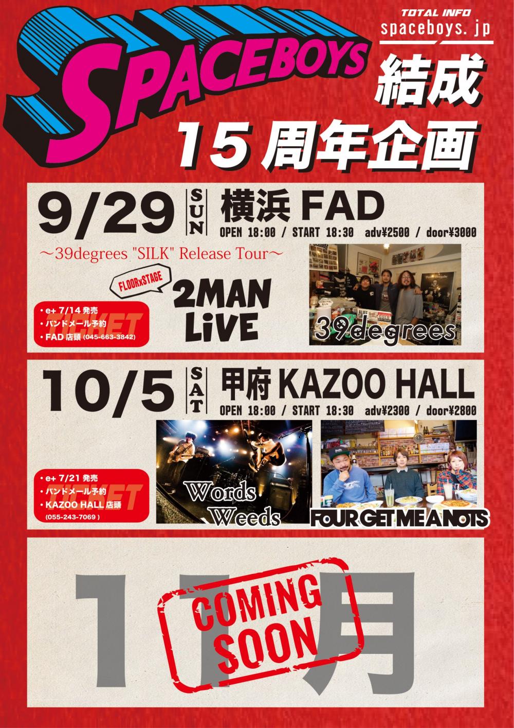 KAZOO HALL 18th AnniversarySPACE BOYS presents SPACE BOYS"15周年企画甲府編"OPEN 18:00 / START 18:30 adv ¥2300(D別) / day ¥2800(D別) [出演] -チケット取扱い- |