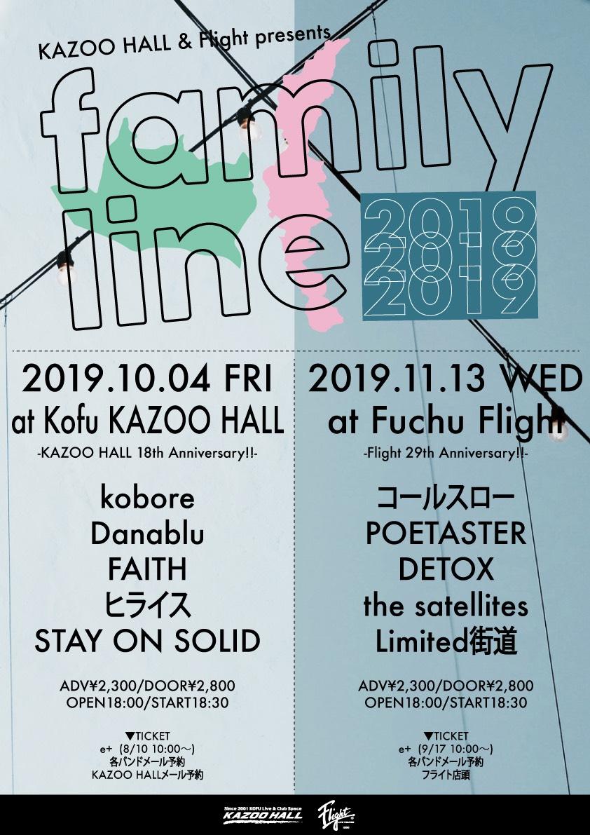 KAZOO HALL 18th Anniversary甲府KAZOO HALL&府中Flight presents family line 2019OPEN 18:00 / START 18:30 adv ¥2300(D別) / day ¥2800(D別) [出演] -チケット取扱い- |