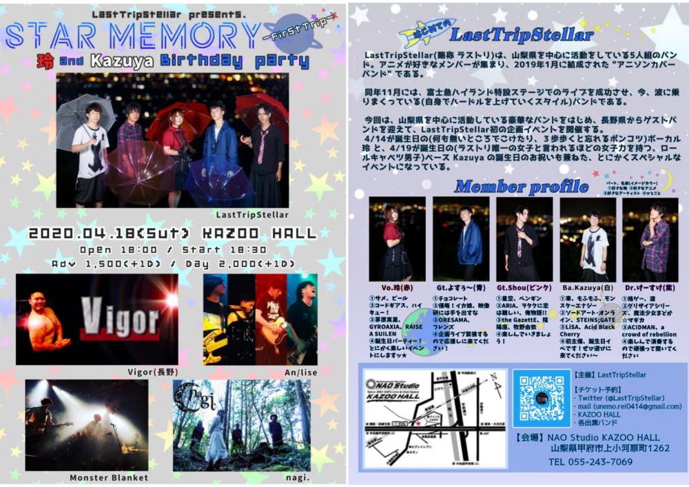 LastTripStellar presentsStar memory -first trip- "玲&Kazuya Birthday party"OPEN TBA / START TBA adv ※中止 / day ※中止 [出演] |