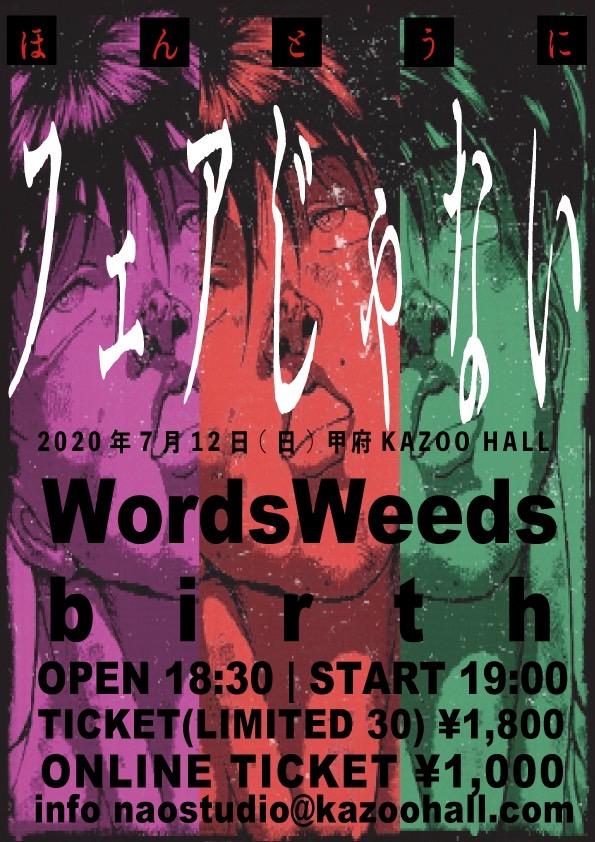 WordsWeeds x birth presentsフェアじゃない vol.3OPEN 18:30 / START 19:00 adv ¥1800(D別) / day ¥2300(D別) [出演] チケット発売日 |