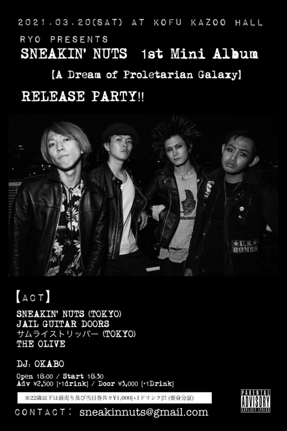 RYO presentsSNEAKIN' NUTS 1st ミニアルバム「プロレタリアの銀河の夢TOUR 2021」in 甲府OPEN 18:00 / START 18:30 adv ¥2500(D別)※学割あり(22歳以下はチケット代¥1000-) / day ¥3000(D別) [出演] -チケット取り扱い- |