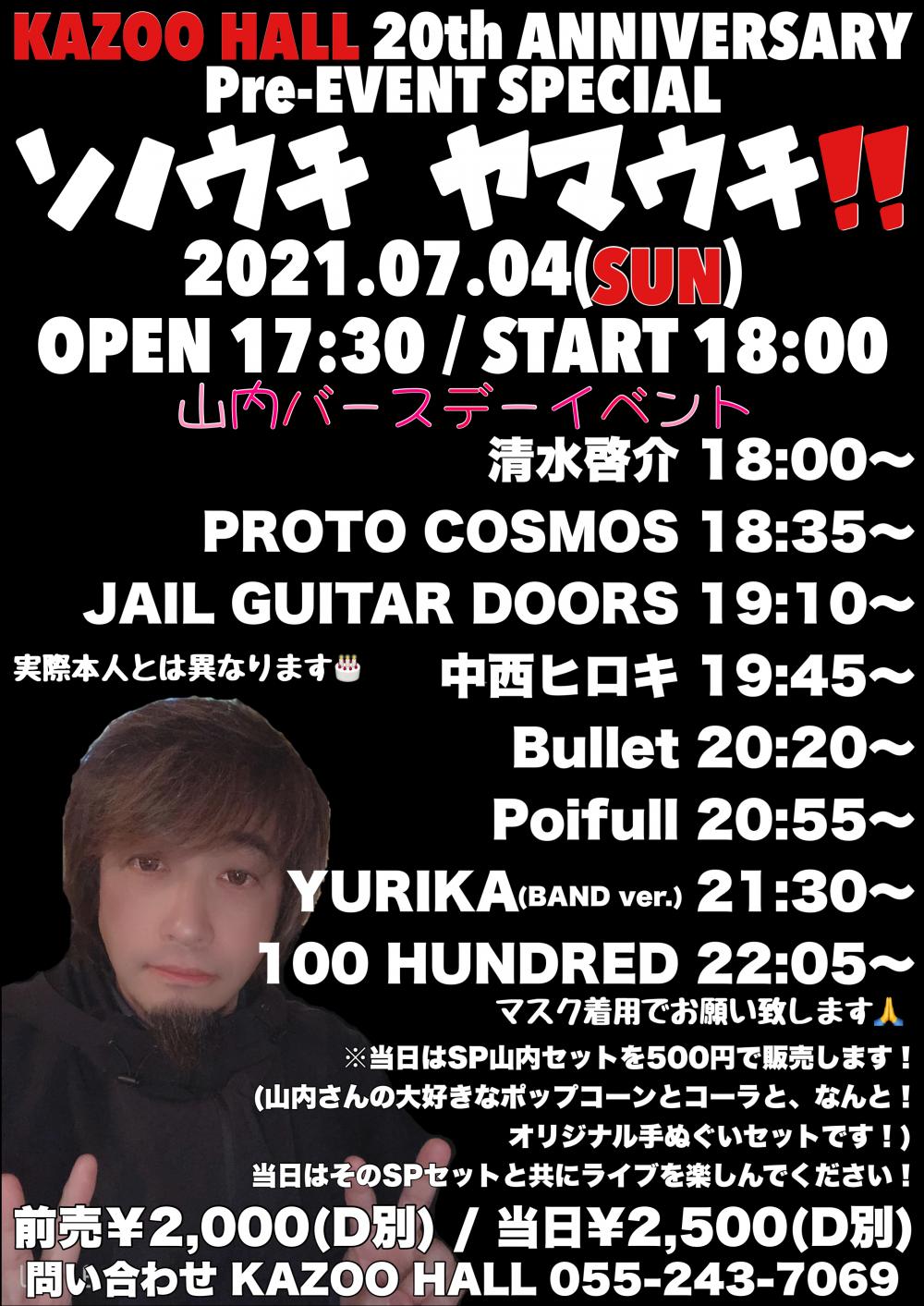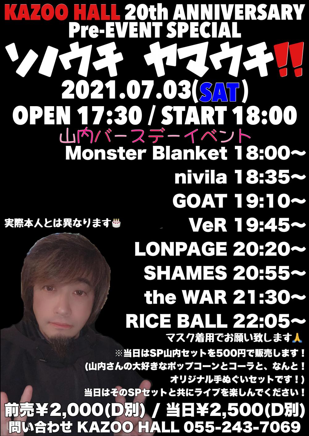KAZOO HALL presents 山内バースデーイベントKAZOO HALL 20th ANNIVERSARY Pre-EVENT SPECIAL ソノウチ~ヤマウチ~OPEN 17:30 / START 18:00 adv ¥2000(D別) / day ¥2500(D別) [出演] [チケット取扱い] |