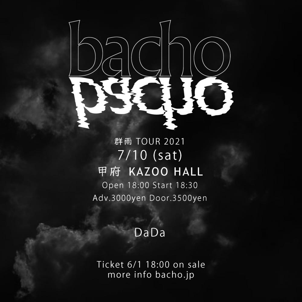 bacho 群雨TOUROPEN 18:00 / START 18:30 adv ¥3000(D別) / day ¥3500(D別) [出演] [チケット取扱い] |