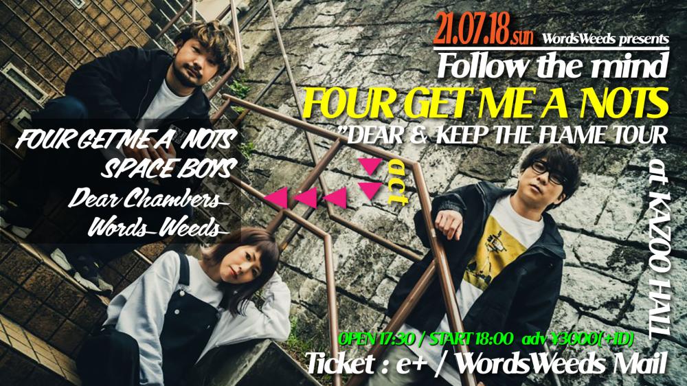 WordsWeeds presentsFollow the mind -FOUR GET ME A NOTS "DEAR & KEEP THE FLAME TOUR" -OPEN 17:30 / START 18:00 adv ¥3000(D別) / day ¥3500(D別) |