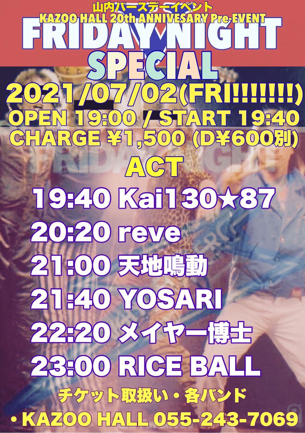 KAZOO HALL x RICEBALL presents 山内バースデーイベントKAZOO HALL 20th ANNIVERSARY Pre-EVENT SPECIAL FRIDAY NIGHT V SPECIALOPEN 19:00 / START 19:40 adv ¥1500(D別) / day ¥1500(D別) [出演] [チケット取扱い] |