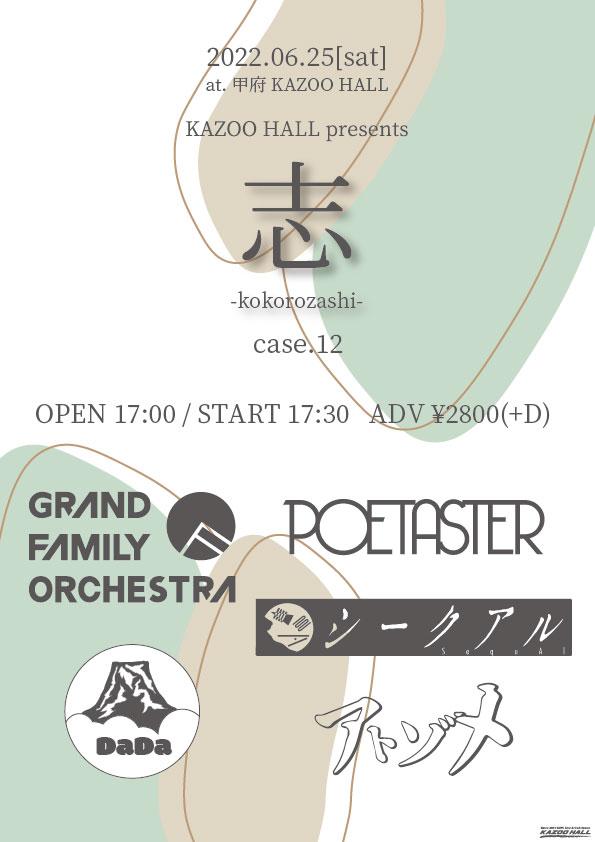 KAZOO HALL presents志-kokorozashi- case.12OPEN 17:00 / START 17:30 adv ¥2800(D別) / day ¥3300(D別) |