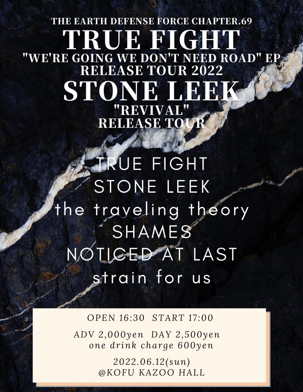 KAZOO HALL presentsThe Earth Defense Force chapter.71 TRUE FIGHT [We're going We don't need roads. RELEASE TOUR 2022] STONE LEEK["REVIVAL"release tour]OPEN 16:30 / START 17:00 adv ¥2000(D別) / day ¥2500(D別) [出演] [チケット取扱い] |