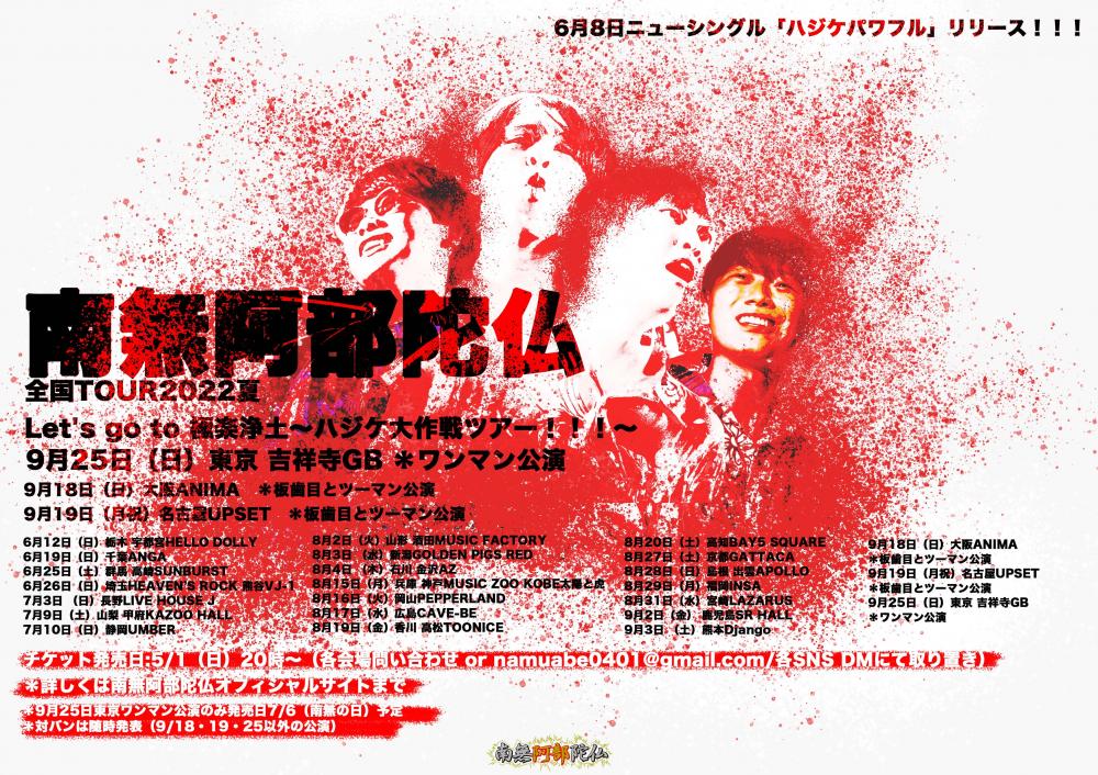 KAZOO HALL presents南無阿部陀仏 全国TOUR2022夏「Let's go to 極楽浄土~ハジケ大作戦ツアー!!!~」 & 板歯目 全国TOUR2022夏「爬虫類超絶大空ぐるぐるタケコプター!そんじゃあ3人でレッツラゴー!」OPEN 17:30 / START 18:00 adv ¥2400(D別) / day ¥2900(D別) |