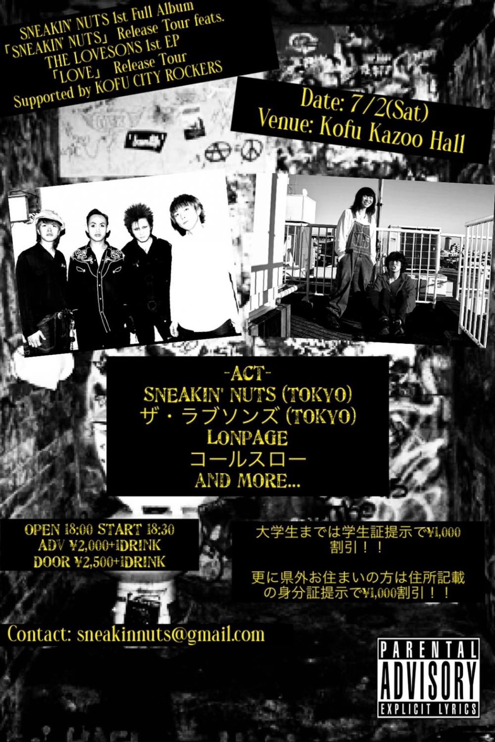 RYO presents.SNEAKIN' NUTS 1st Full Album 「SNEAKIN' NUTS」リリースツアー&ザ・ラブソンズ 1st EP 「LOVE」リリースツアー甲府編OPEN 18:30 / START 19:00 adv ¥2000(D別) / day ¥2500(D別) [出演] [チケット取扱い] |