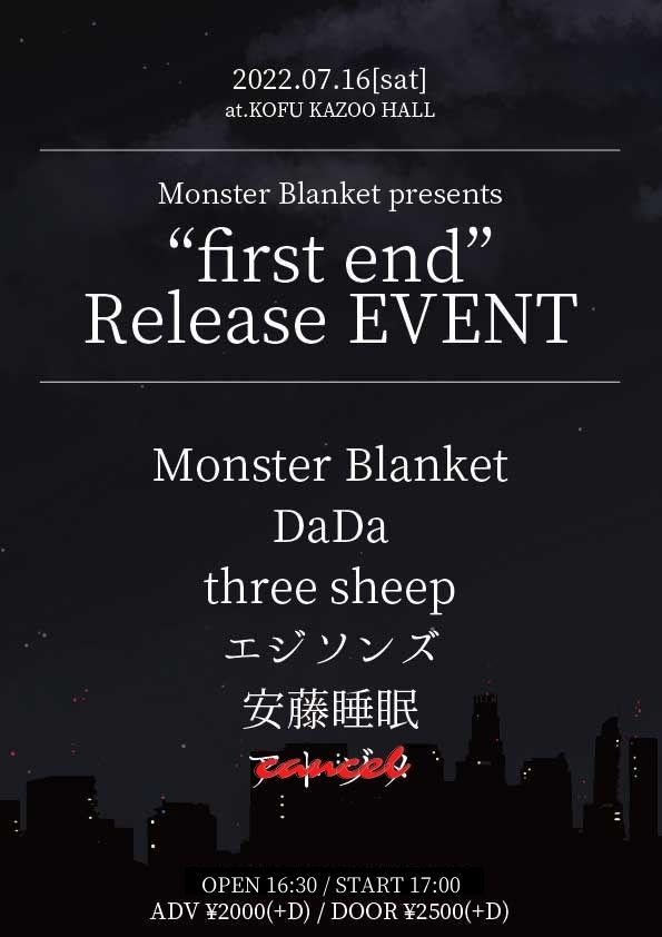 Monster Blanket presents"first end" Release EVENT!!!OPEN 16:30 / START 17:00 adv ¥2000(D別) / day ¥2500(D別) [出演] [チケット取扱い] |