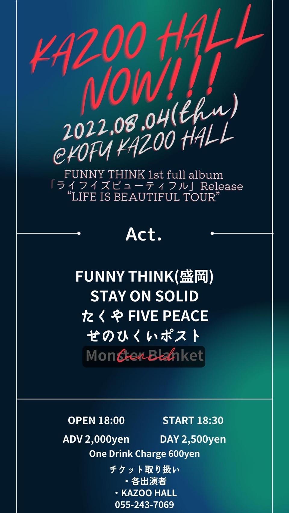 KAZOO HALL presentsKAZOO HALL NOW!! FUNNY THINK 1st full album 「ライフイズビューティフル」Release “LIFE IS BEAUTIFUL TOUR”OPEN 18:30 / START 19:00 adv ¥2000(D別) / day ¥2500(D別) [出演] [チケット取扱い] |