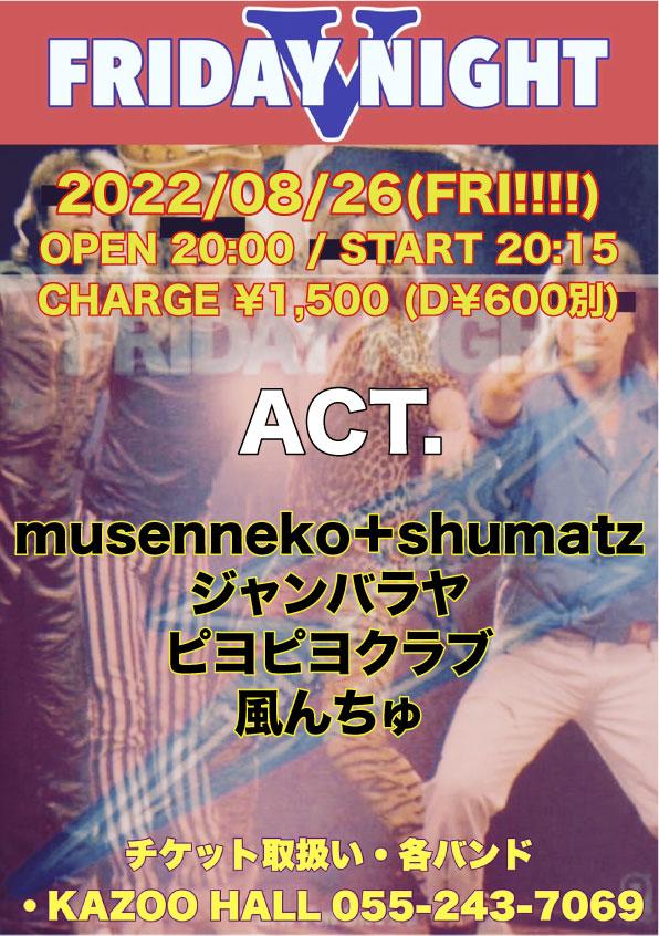KAZOO HALL presentsFRIDAY NIGHT VOPEN 20:00 / START 20:15 adv ¥1500(D別) / day ¥1500(D別) [出演] [チケット取扱い] |