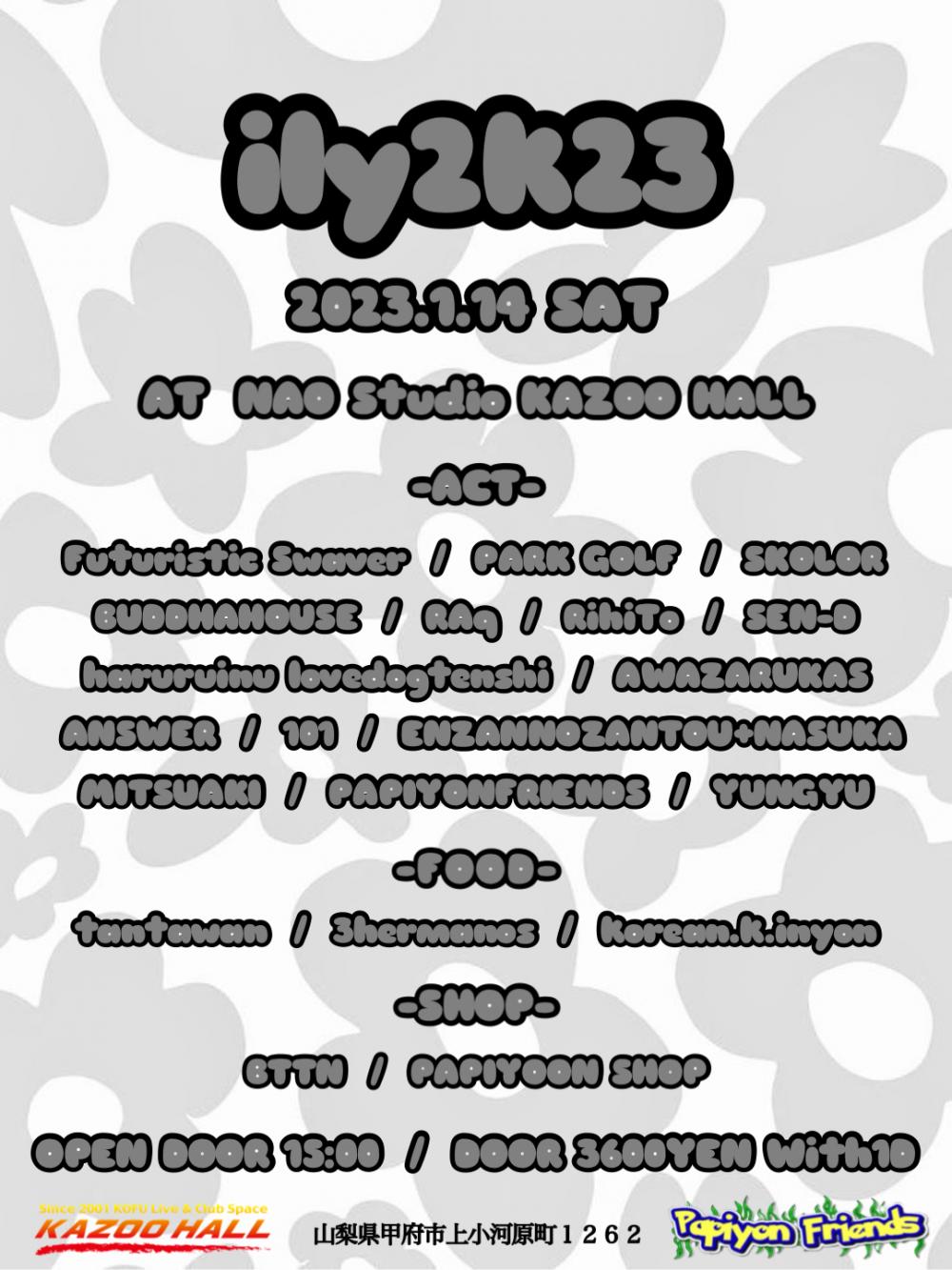 YUNGYU presentsily2k23OPEN 15:00 / START 15:00 adv ¥3000(D別) / day TBA [出演] [チケット取扱い] |