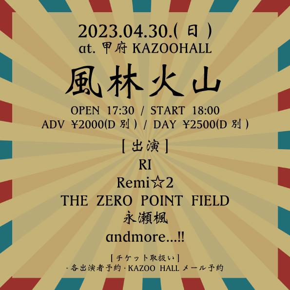 KAZOO HALL presents風林火山OPEN 17:30 / START 18:00 adv ¥2000(D別) / day ¥2500(D別) [出演] [問い合わせ] |