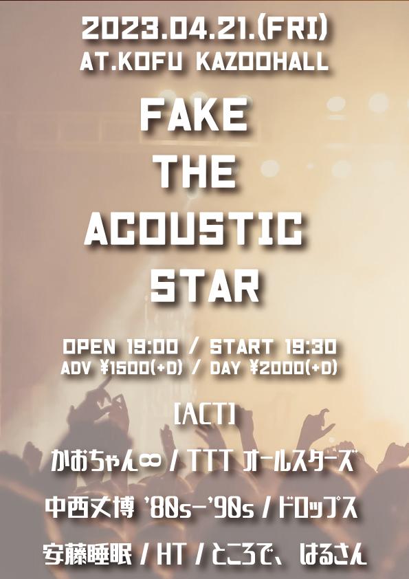 KAZOO HALL presentsFAKE THE ACOUSTIC STAROPEN 19:00 / START 19:30 adv ¥1500(D別) / day ¥2000(D別) [出演] (お問い合わせ) KAZOO HALL 055-243-7069 若尾まで |