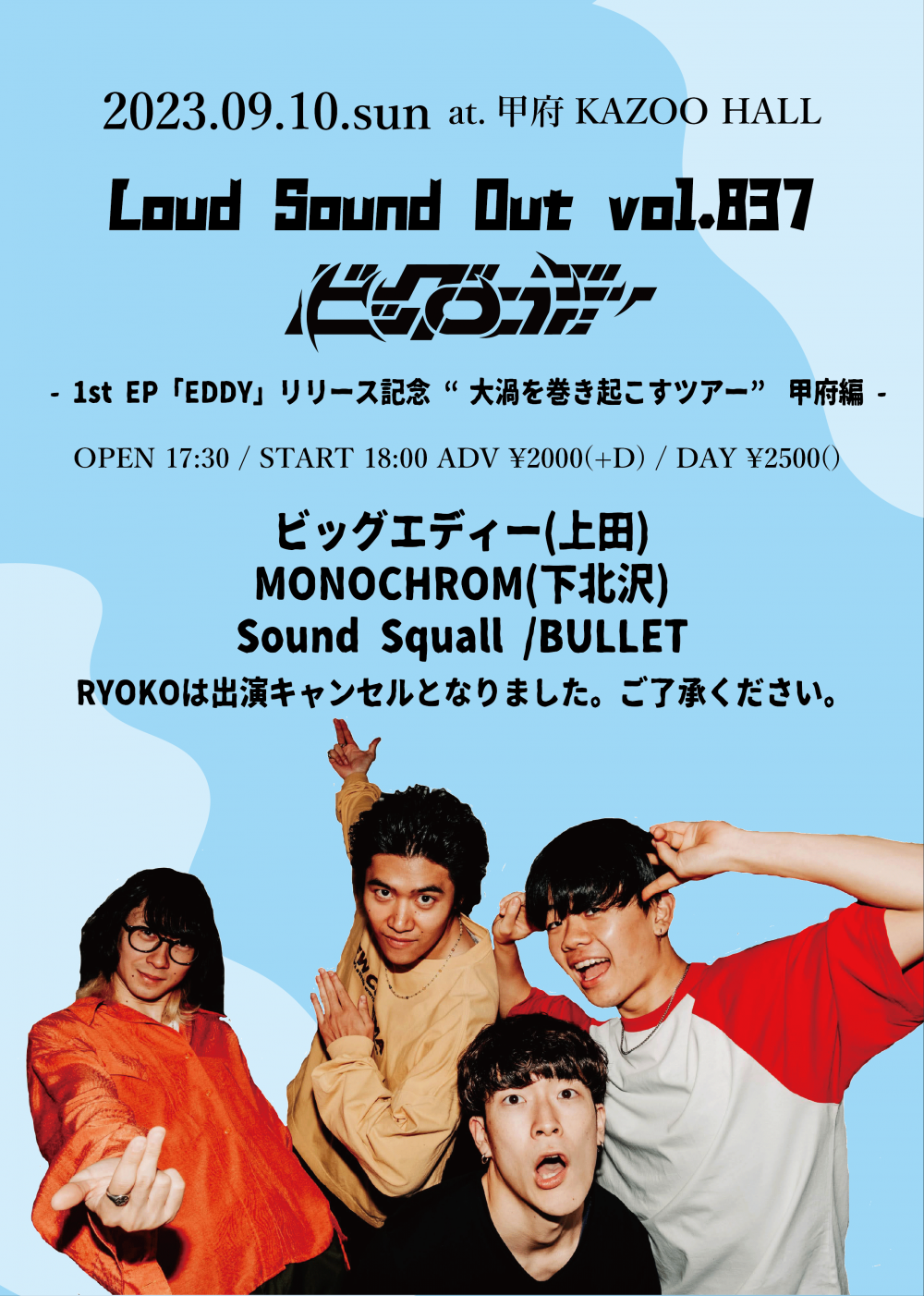 KAZOO HALL presentsLoud Sound Out vol.837 - ビッグエディー 1st EP「EDDY」リリース記念 “大渦を巻き起こすツアー” 甲府編 -OPEN 18:00 / START 18:30 adv ¥2000(D別) / day ¥2500(D別) [出演] [チケット取扱い] |
