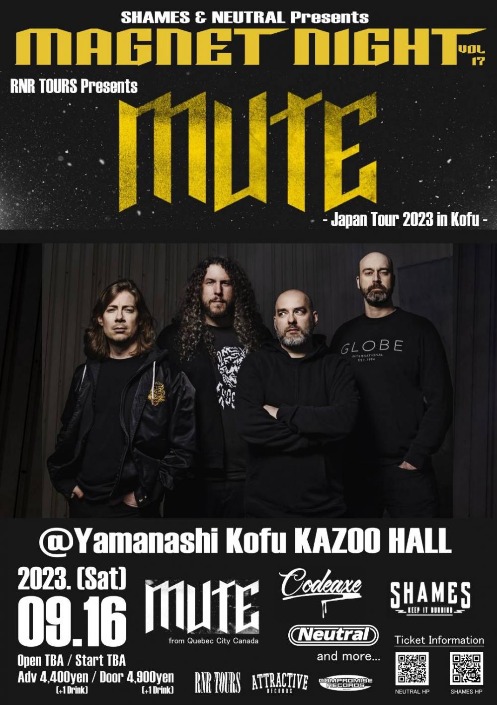 Romantic Nobita Records , SHAMES , NEUTRAL presentsMAGNET NIGHT vol.17 -MUTE JAPAN TOUR 2023 in Kofu-OPEN 16:30 / START 17:00 adv ¥4400(D別) ※学割¥2400(D別) / day ¥4900(D別) ※学割¥2900(D別) [出演] [チケット取扱い] |