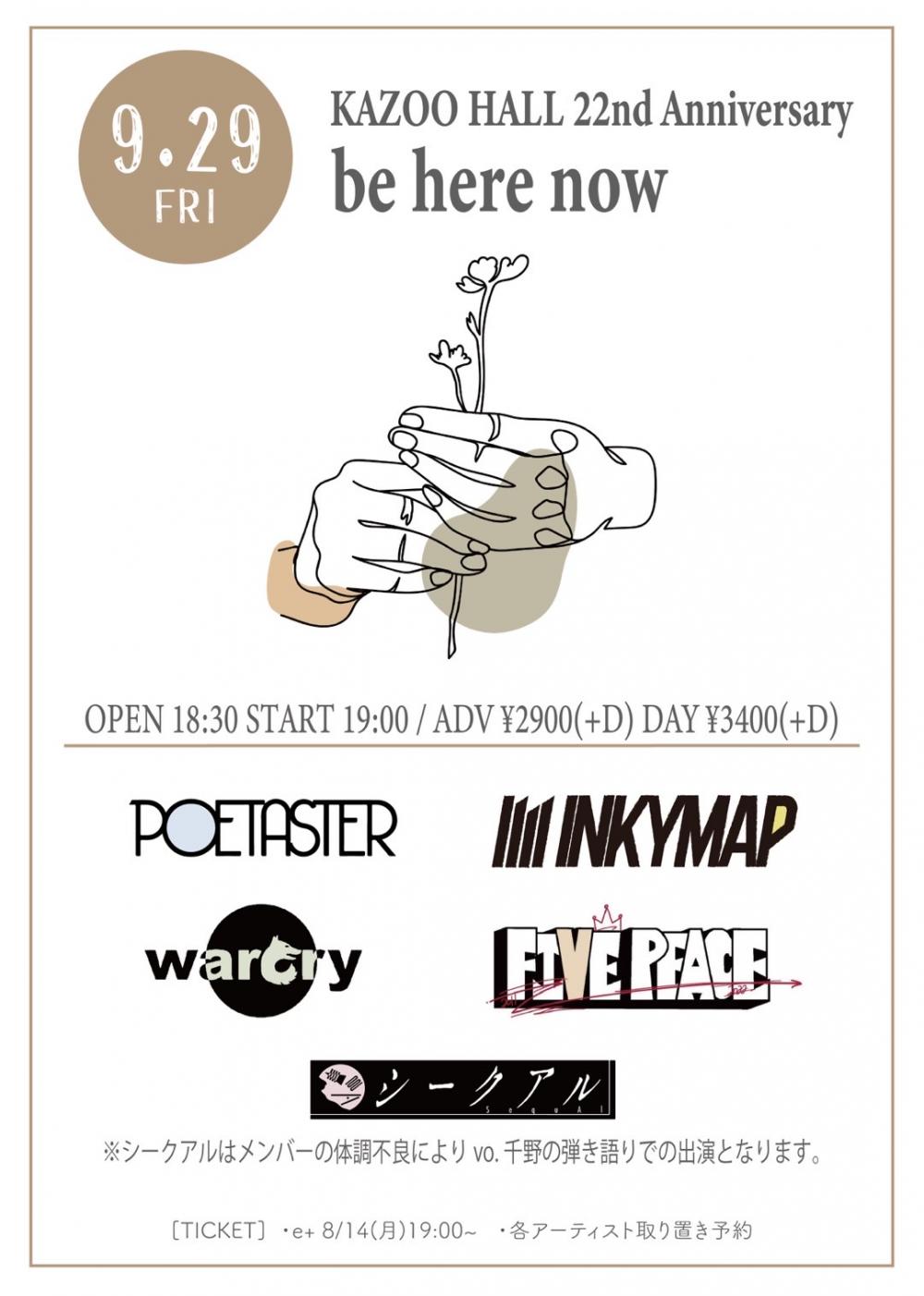 KAZOO HALL 22nd Anniversarybe here nowOPEN 18:30 / START 19:00 adv ¥2900(D別) / day ¥3400(D別) [出演] [チケット取扱い] |