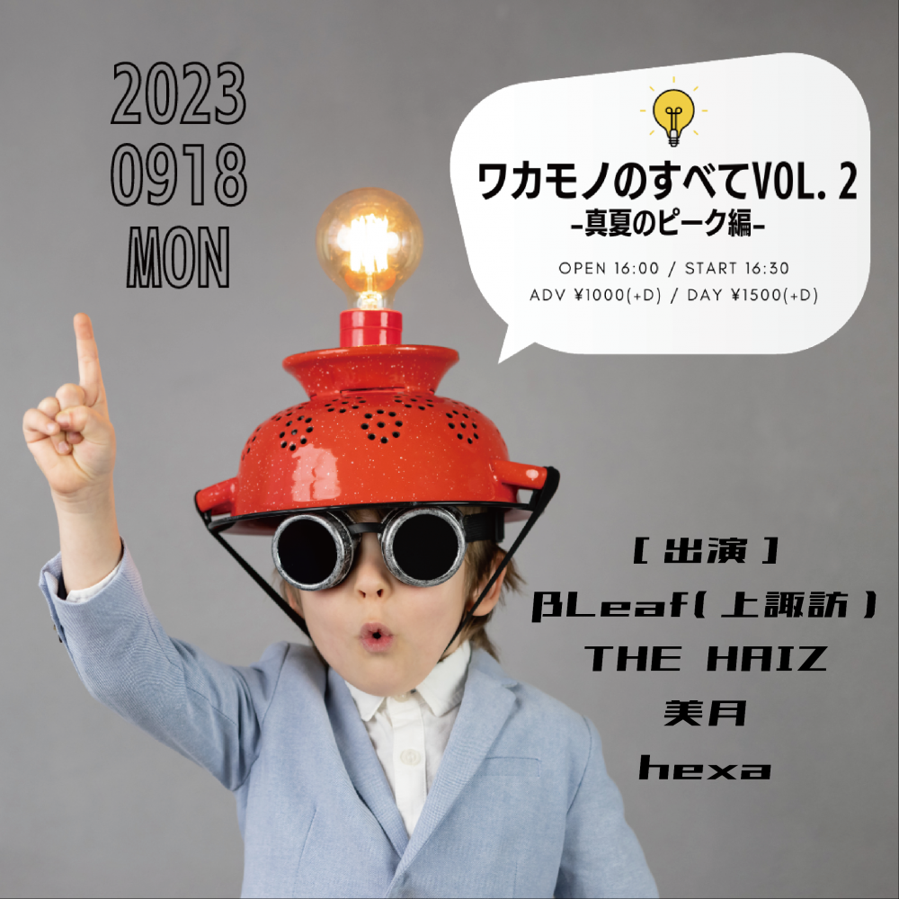 KAZOO HALL presentsワカモノのすべてvol.2 -真夏のピーク編-OPEN 16:00 / START 16:30 adv ¥1000(D別) / day ¥1500(D別) [出演] [チケット取扱い] |
