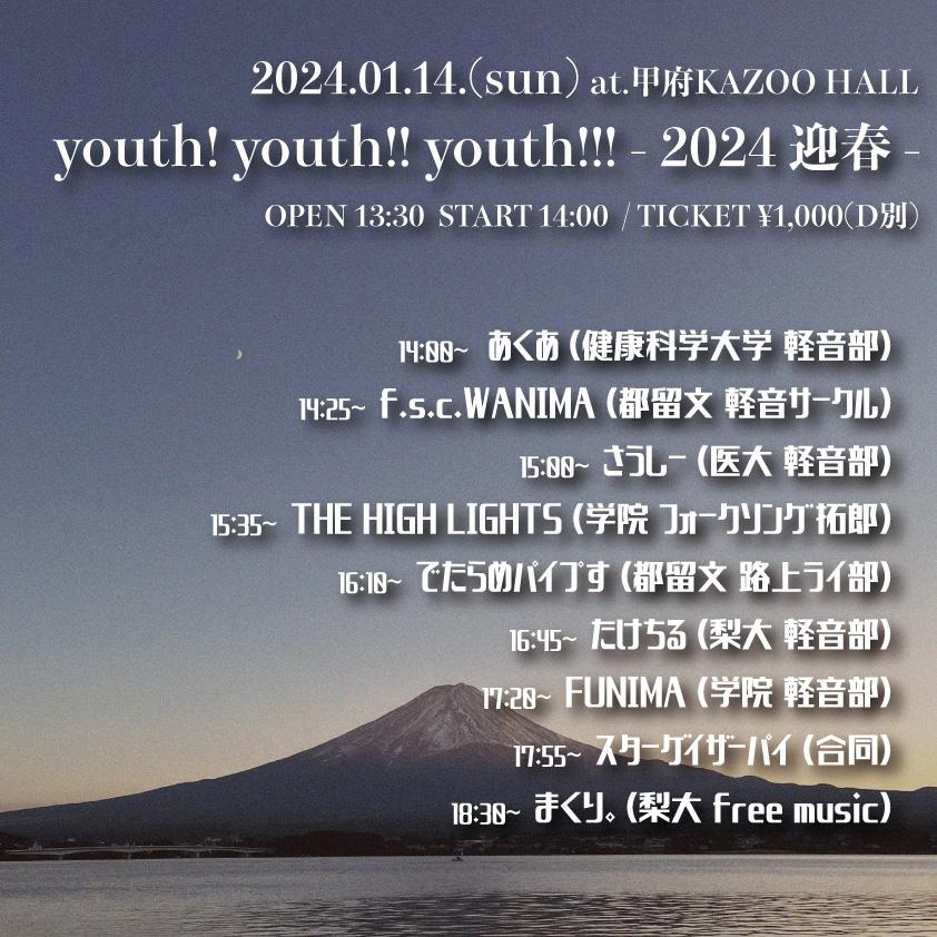 KAZOO HALL presentsyouth! youth!! youth!!! -2024 迎春-OPEN 13:30 / START 14:00 adv ¥1000(D別) / day ¥1000(D別) [出演] [チケット取扱い] |