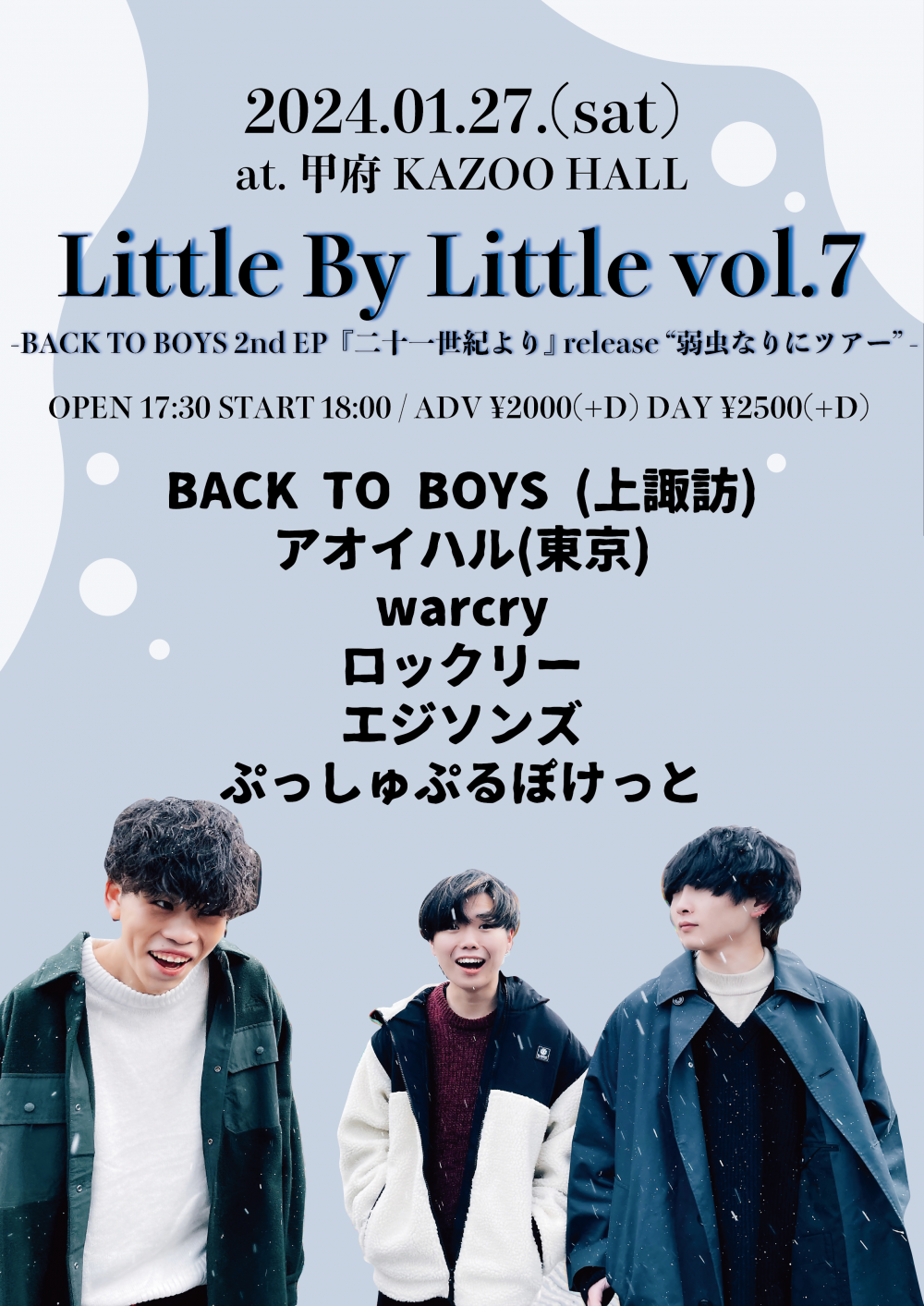 KAZOO HALL presentsLittle By Little vol.7 -BACK TO BOYS 2nd EP『二十一世紀より』 release “弱虫なりにツアー” -OPEN 17:30 / START 18:00 adv ¥2000(D別) / day ¥2500(D別) [出演] [チケット取扱い] |