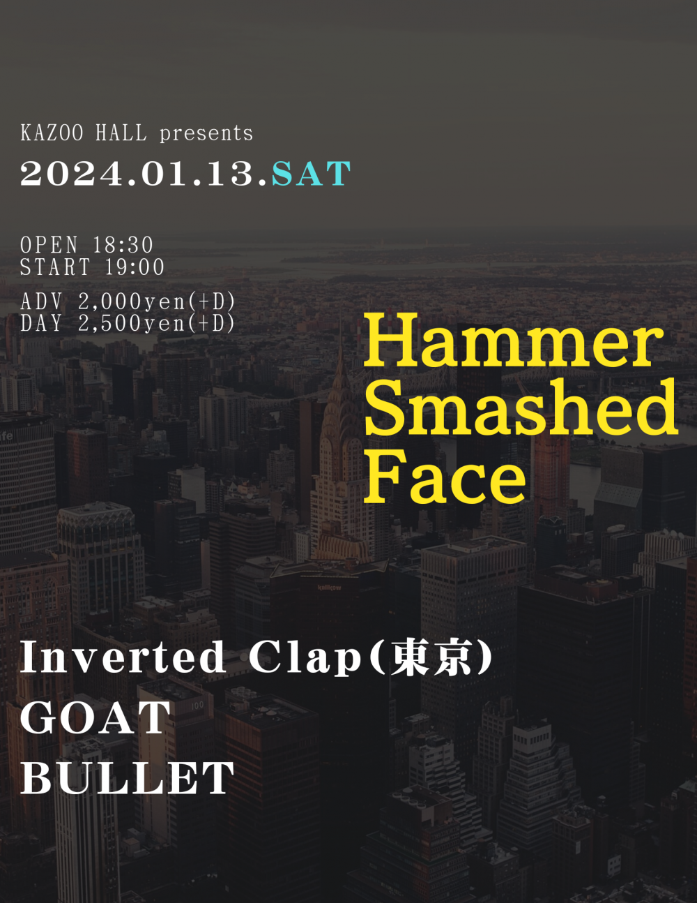 KAZOO HALL presentsHammer Smashed FaceOPEN 18:30 / START 19:00 adv ¥2000(D別) / day ¥2500(D別) [出演] [チケット取扱い] |
