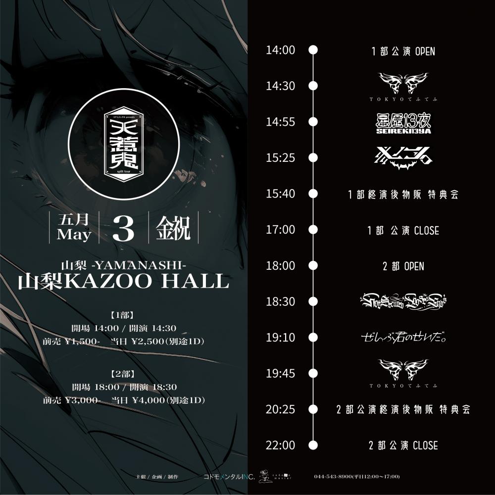 コドモメンタル presentssplit tour “天惹鬼”OPEN 1部 14:00 / 2部18:00 / START 1部 14:30 / 2部 18:30 adv 1部 ¥1500(D別) / 2部 ¥3000(D別) / day 1部 ¥1500(D別) / 2部 ¥3000(D別) |